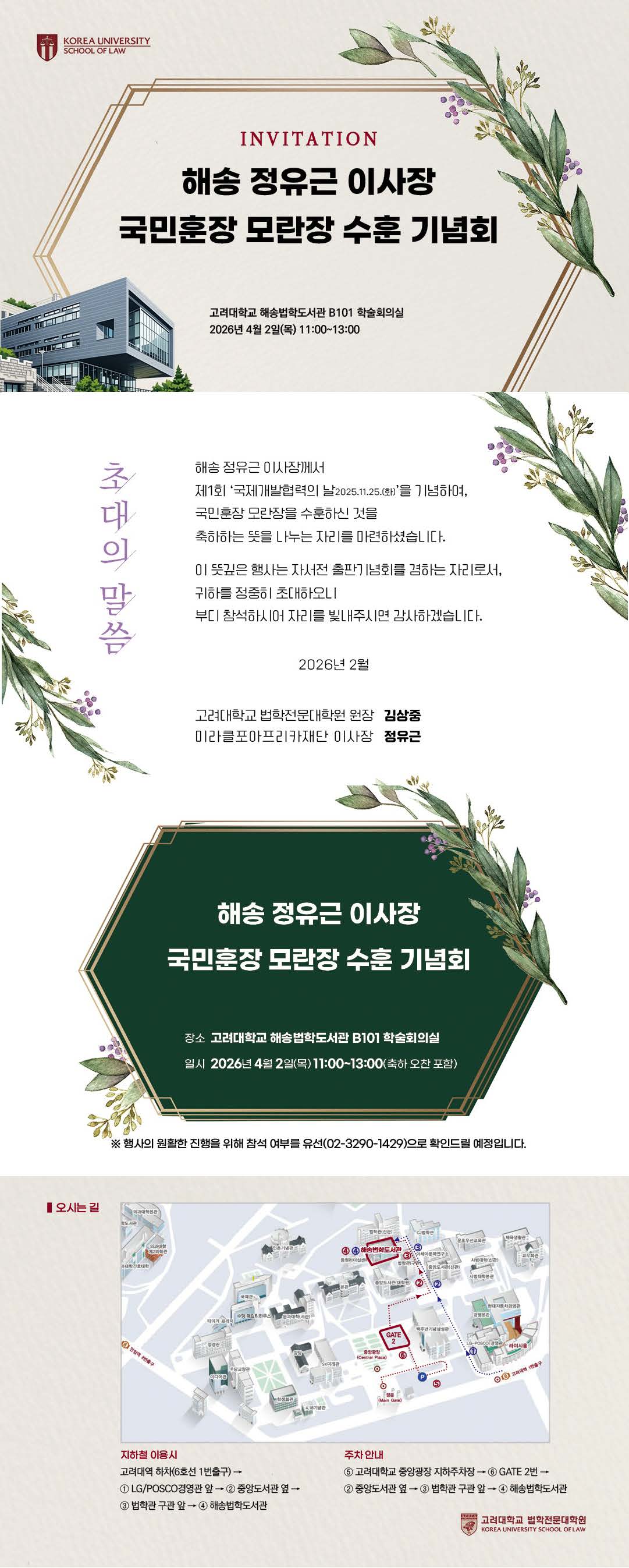 우리 로스쿨은 정유근 이사장의 수훈을 고대법대 구성원과 함께 축하함과 아울러 정유근 이사장께서 말라위의 개척 과정에서 보여주신 열정과 소신, 치열한 삶의 자세 및 봉사와 개척의 숭고한 정신을 오늘의 젊은 학생들에게 알려주고자 하는 마음으로 수훈 기념회를 가지게 되었다. 많은 분들의 축하를 바라며, 고대 로스쿨 역시 최초, 최고의 법 교육 연구기관의 역할에 정진하여 가겠습니다.