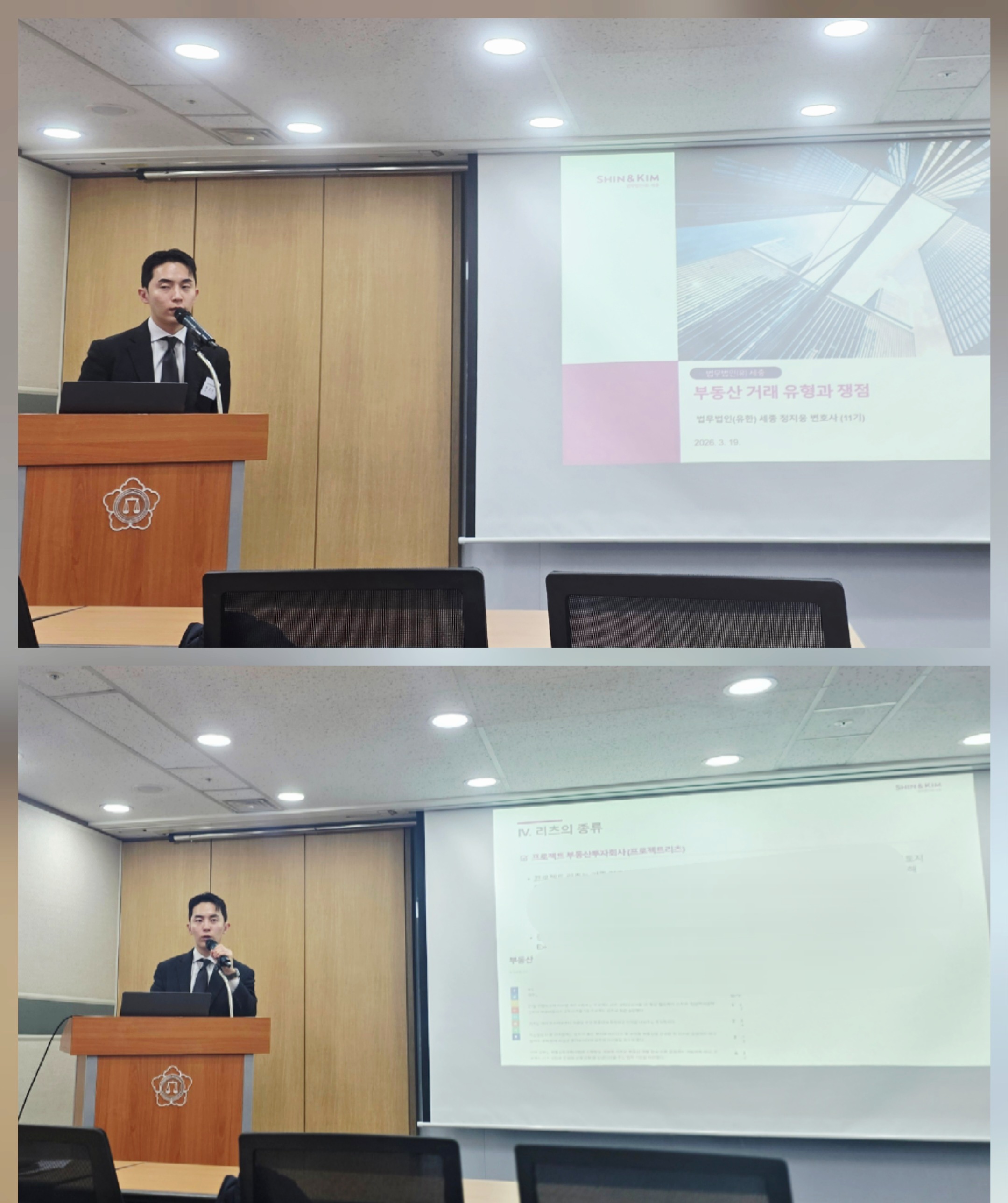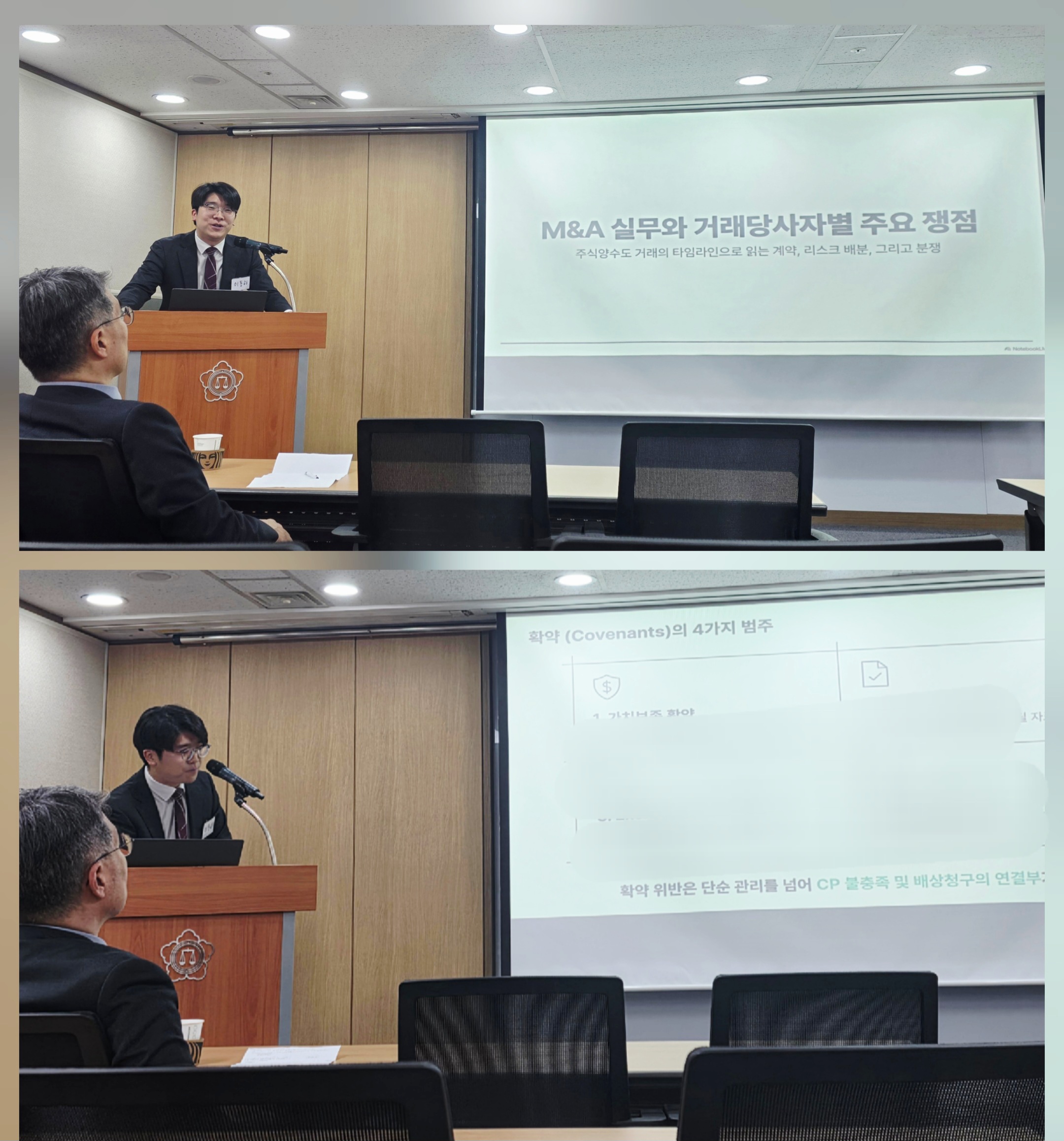 1세션에서는 법무법인 태평양의 이동하변호사가 "M&A 실무와 거래당사자별 주요 쟁점-주식양수도 거래의 타임라인으로 읽는 계약, 리스크 배분, 그리고 분쟁"에 관한 발표를, 2세션에서는 법무법인 세종의 정지웅변호사가 "부동산 거래 유형과 쟁점"에 관한 발표를 하였다.