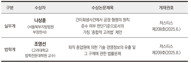 면밀한 검토와 논의를 거쳐 심사한 결과, 실무계 법학논문상은 나상훈 부장판사의 논문 '간이회생사건에서 공정·형평의 원칙 준수 여부 판단기준으로서의 가칭 ‘종합적 고려법’ 제안'이, 법학계 법학논문상은 조영선 교수의 논문 '퇴직 종업원에 의한 기술·경영정보의 유출 및 그 구제에 관한 법률문제'가 선정됐다.