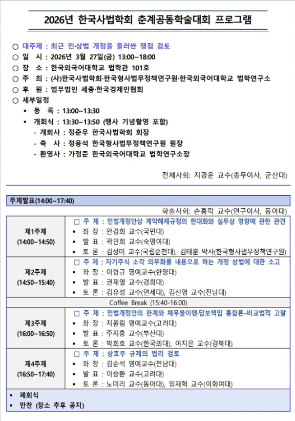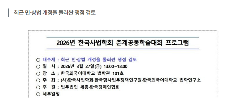 (사)한국사법학회·한국형사법무정책연구원·한국외국어대학교 법학연구소는 2026년 3월 27일 금요일 오후 1시부터 서울 동대문구 이문동에 위치한 한국외국어대학교 법학관 101호에서 ‘최근 민·상법 개정을 둘러싼 쟁점 검토’라는 주제로 춘계공동학술대회를 개최한다.