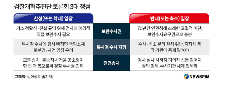 존치 측은 검사가 기록만으로 기소를 결정하면 실체적 진실 발견이 어렵다는 논리를 편다. 김상현 고려대 법학전문대학원 교수는 "소추권에는 이를 정상적으로 행사하기 위한 부수적 권한이 당연히 인정돼야 한다"며 "영국·핀란드 등 수사·기소 분리 국가들도 관행적으로 검사의 보완수사를 허용한다"고 밝혔다.