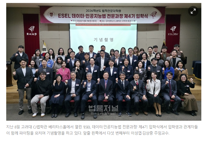 [법률저널=이상연 기자] 고려대학교 로스쿨(원장 김상중)은 지난 8일 서울 성북구 종암동 고려대 CJ법학관 베리타스홀에서 ‘ESEL 데이터·인공지능법 전문과정’(주임교수 김상중·이성엽) 제4기 입학식을 개최했다고 밝혔다.