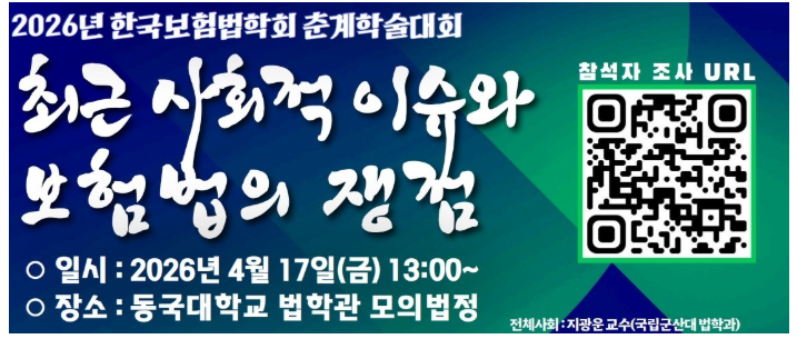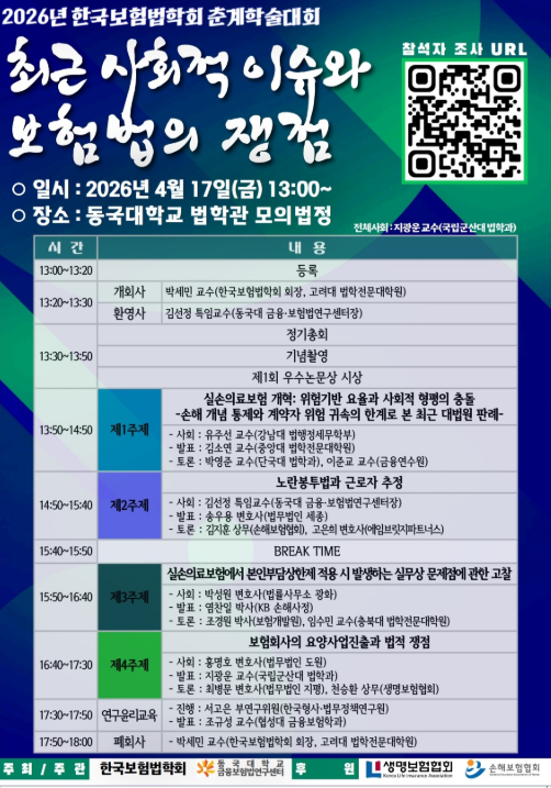 한국보험법학회(회장 박세민)·동국대학교 금융·보험법연구센터(센터장 김선정)는 2026년 4월 17일 금요일 오후 1시부터 서울 중구 필동 동국대학교 법학과 모의법정에서 ‘최근 사회적 이슈와 보험법의 쟁점’ 이라는 주제로 2026년 한국보험법학회 춘계학술대회를 개최했다.